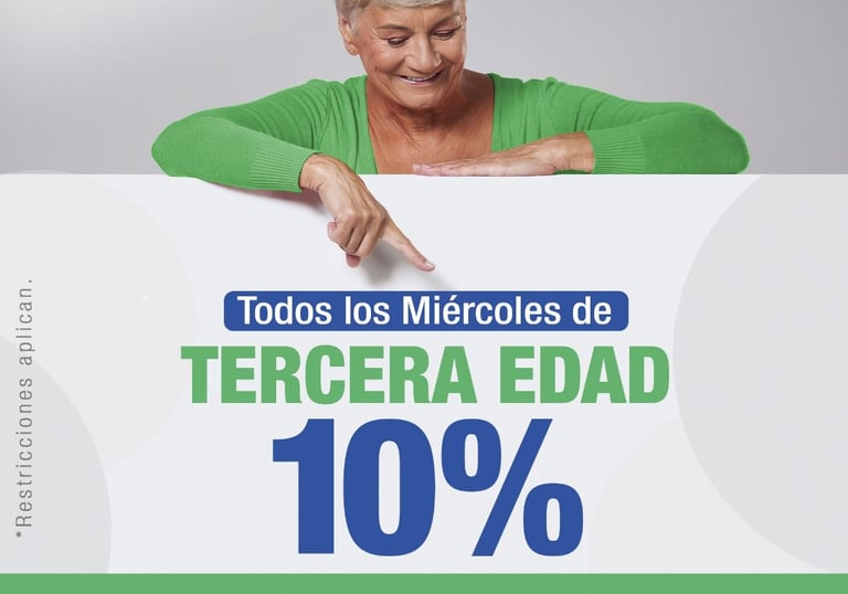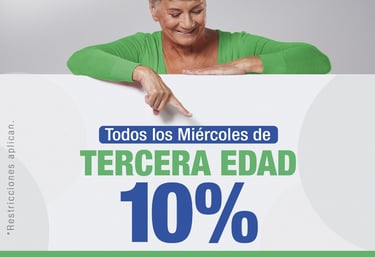 Cuidamos tu salud y economíaes por eso que disfrutas de un 10% de descuento adicional de la tercera edad en tus compras todos los miércoles.